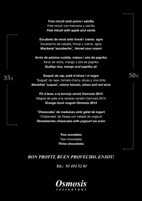 Además del menú de siempre en la versión larga (50€) o corta (35€), al mediodía Osmosis ofrece el menú exprés de 3 platos a elegir por 25 € iva incluido + bebida. Una excelente opción para los poco hambrientos o con poco tiempo.