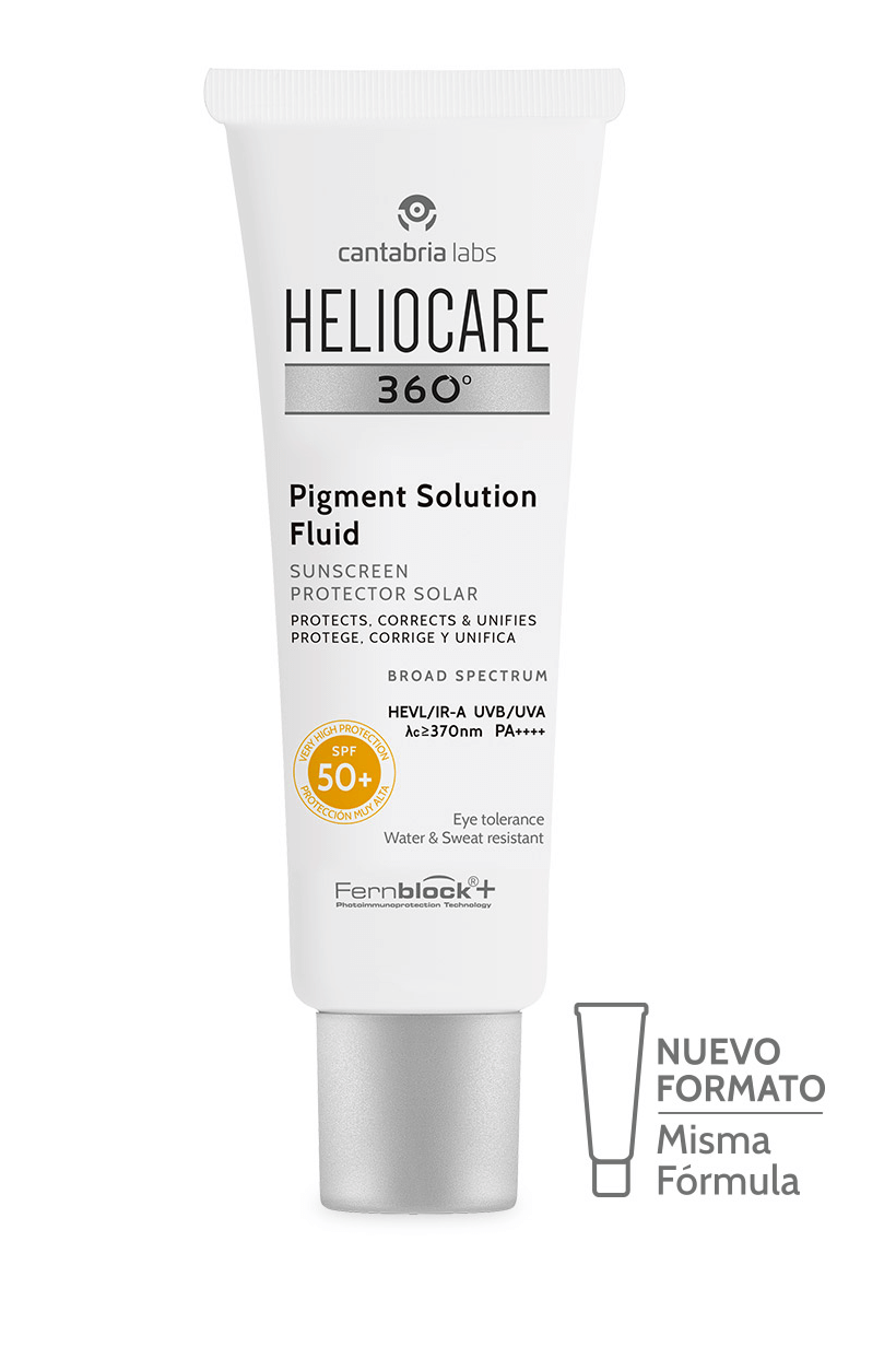 Heliocare 360º Pigment Solution Fluid SPF50+ propone una fórmula que aporta una protección solar de amplio espectro combinada con ingredientes que ayudan a disminuir la intensidad de las manchas y unificar el tono de piel.