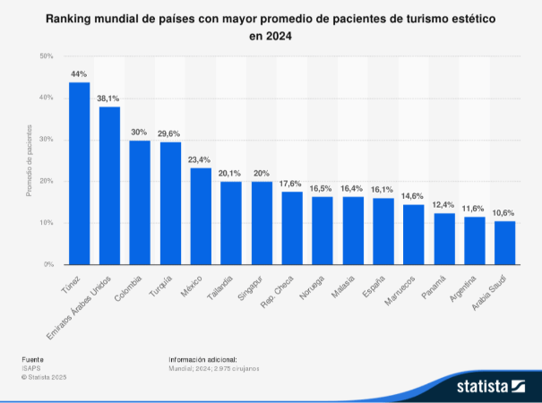 Así lo asegura el estudio internacional sobre procedimientos estéticos realizado por la Sociedad Internacional de Cirugía Plástica Estética (ISAPS por sus siglas en inglés). Según el informe, en Túnez el 44% de los pacientes que se han sometido a algún tipo de operación estética eran extranjeros. Le sigue los Emiratos Árabes, con un 38,1% y Colombia, con el 30%.