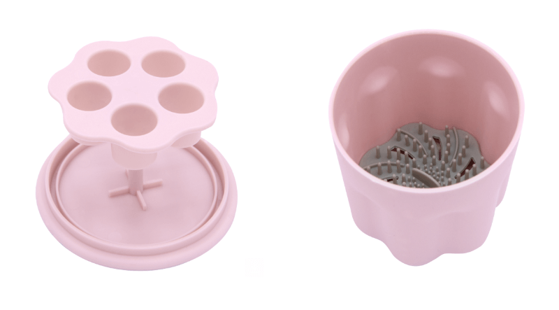 Este limpiador incluye una alfombrilla de silicona con textura especial para eliminar suciedad, restos de maquillaje e impurezas sin esfuerzo. Además, incorpora un soporte en el que colocar las brochas para que se sequen al aire tras el lavado, evitando deformaciones en las cerdas.