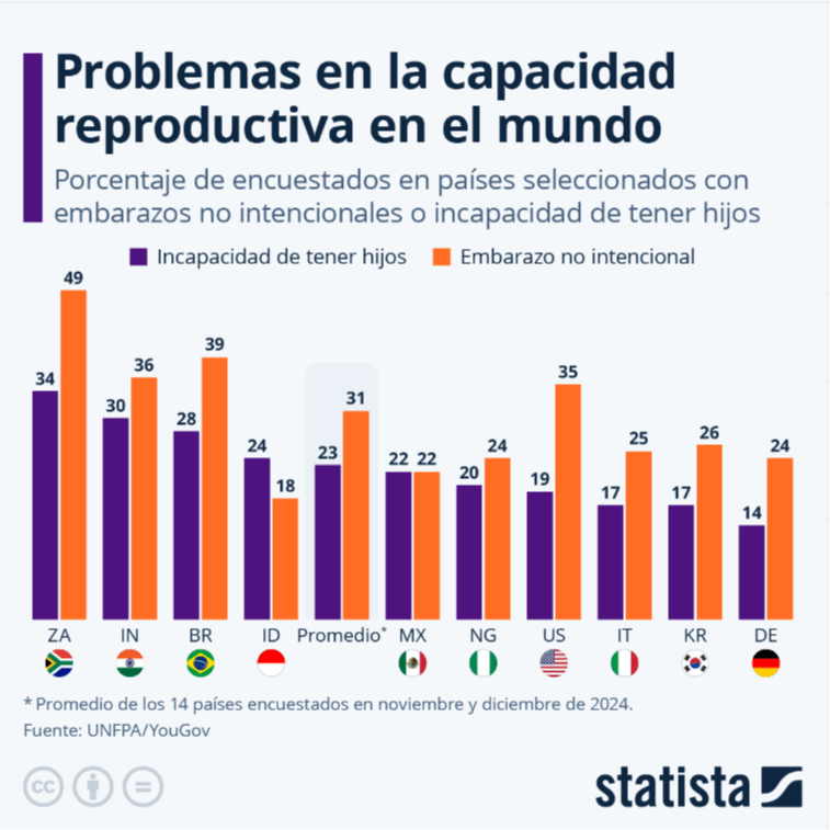 Otro estudio elaborado por el Fondo de Población de las Naciones Unidas (UNFPA por sus siglas en inglés) confirma esta tendencia en todo el mundo. Según el informe, más de un 30% de los embarazos a nivel mundial no son intencionales, mientras que la incapacidad de tener hijos afecta, aproximadamente, a un 23% de la población del planeta.