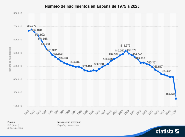 Según datos del Instituto Nacional de Estadística (INE), la natalidad en España ha descendido de forma sostenida desde 2008, cuando se alcanzó el máximo de nacimientos en el siglo XXI (520.000). Desde entonces, la cifra ha disminuido incluso por debajo de los mínimos registrados en 1995 y 1996, cuando la crisis económica redujo drásticamente la natalidad.