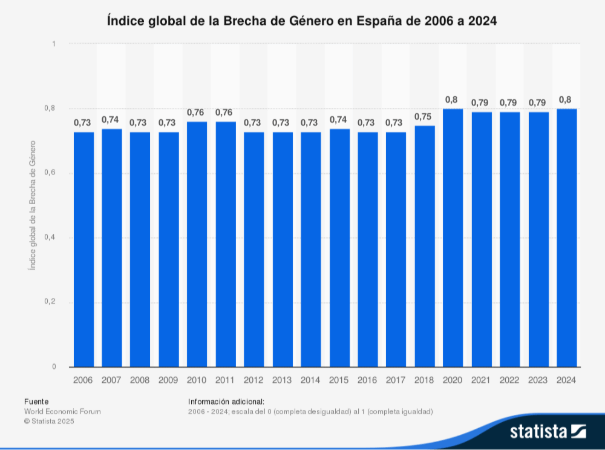 La brecha de género en España se mantiene estable en el 79,7%. Según los datos del índice global de la brecha de género, a España le falta un 20% para conseguir la igualdad efectiva. Se trata de un porcentaje que, si bien se ha estancado desde 2020, ubica a España en el TOP10 de ...