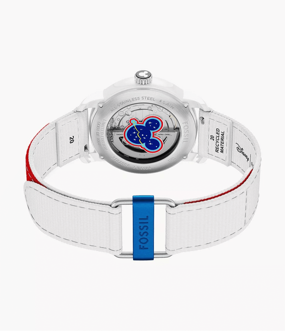 El diseño combina la artesanía relojera de Fossil con la magia del universo Disney. Con una esfera de color azul galáctico, Saturno girando como segundero y con una caja blanca, inspirada en los trasbordadores espaciales.