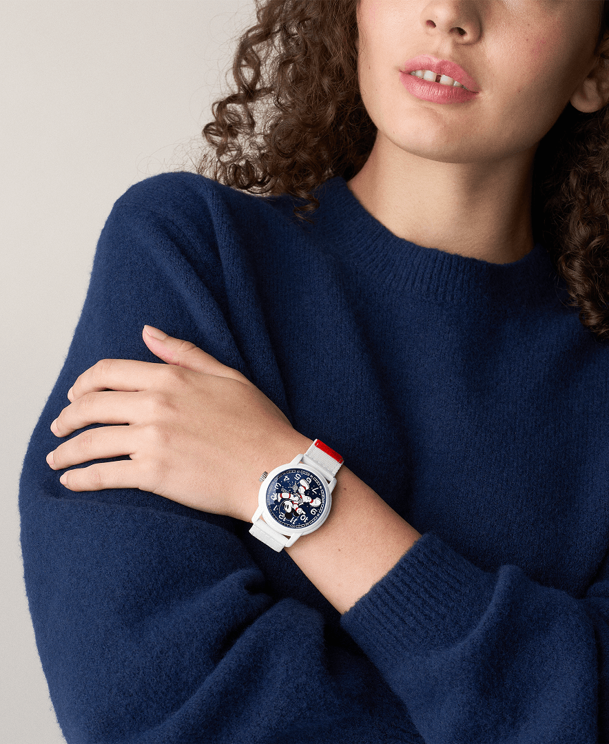 Con una esfera con cristal mineral, cuenta con una corona en la que también aparece la silueta de la cara de Mickey Mouse. Además, el reloj es resistente al agua hasta 5 ATM.