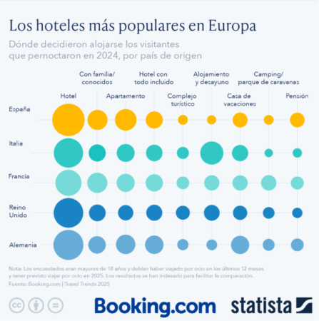 Las pernoctaciones hoteleras en España crecieron un 0,8% durante los nueve primeros meses de 2025. El sector hotelero ha recuperado el pulso en un país donde la industria turística es cada vez más importante, sobre todo en las islas y la costa del mediterráneo. Sin embargo, ya hace años que los hoteles no cuentan con el monopolio de las pernoctaciones de los viajeros en el país. Según el informe Travel Trends 2025 publicado por el portal de reservas Booking.com el hotel sigue siendo la opción favorita a la hora de visitar España. Sin embargo, los apartamentos ganan peso y se convierten en la segunda opción más popular, por delante del número de personas que decide visitar el país hospedándose en una vivienda familiar o con conocidos.