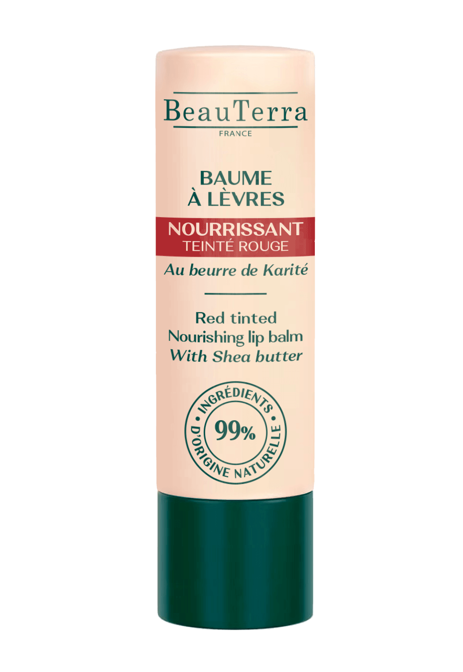 Bálsamo labial nutritivo, de BeauTerra. Dos presentaciones: color rojo o sin color. Hidrata, calma y protege los labios de las agresiones externas y repara el dañado causado por la sequedad. Apto para todo tipo de labios, incluso los más secos y agrietados. Con manteca de karité, aceite de girasol y cera de origen vegetal. Nutre intensamente y suaviza. Tras su aplicación, los labios recuperan la flexibilidad y la comodidad. Aroma goloso a vainilla. Dermatológicamente probado.