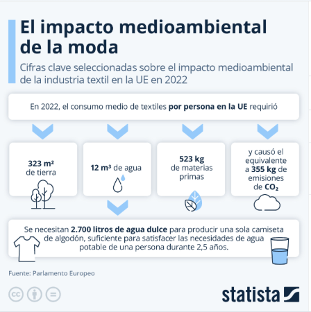 Según estimaciones del Parlamento Europeo, el consumo anual de ropa y textiles de cada ciudadano de la Unión Europea (UE) requiere 12.000 litros de agua y genera 355 kg de emisiones de gases de efecto invernadero. El consumo de ropa por persona y año en Europa también demanda 523 kg de materias primas y 323 m² de tierra, lo que genera un impacto completamente insostenible para el medio ambiente.