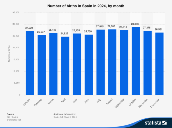 Las dos últimas semanas de septiembre y las dos primeras de octubre constituyen el periodo en el que suele haber más nacimientos en el país. Así lo indican los datos publicados cada año por el Instituto Nacional de Estadística (INE) sobre natalidad. En cambio, los nacimientos descienden considerablemente en diciembre, se recuperan ligeramente en enero, pero vuelven a caer entre febrero y junio. Los meses de verano y otoño son, definitivamente, aquellos en los que más bebés vienen al mundo en España.