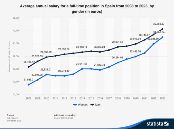 En España, según datos del Instituto Nacional de Estadística (INE), la brecha salarial se traducía en 2023 en una diferencia anual de 1.600 euros. Mientras los hombres que trabajan en España cobran, de media, 32.863 euros brutos por una jornada laboral completa, en el caso de las mujeres la cifra se queda en 31.243 euros. Los datos históricos del INE muestran cómo, en todos los años, los hombres han cobrado más que las mujeres por trabajar las mismas horas, si bien la distancia se ha acortado, especialmente desde 2021.