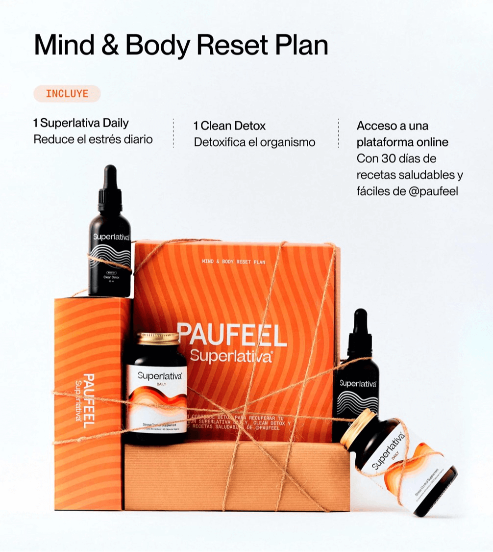 Superlativa, referencia de la gestión del estés en España ha creado, junto a la influencer Paufeel, Mind & Body Reset Plan, un pack de recetas saludables y fáciles de preparar junto a los complementos naturales de Superlativa para favorecer el bienestar y regular el estrés. 30 recetas saludables y muy sencillas de preparar de la mano de Paufeel, reforzadas por los suplementos de Superlativa Daily y Clean Detox.