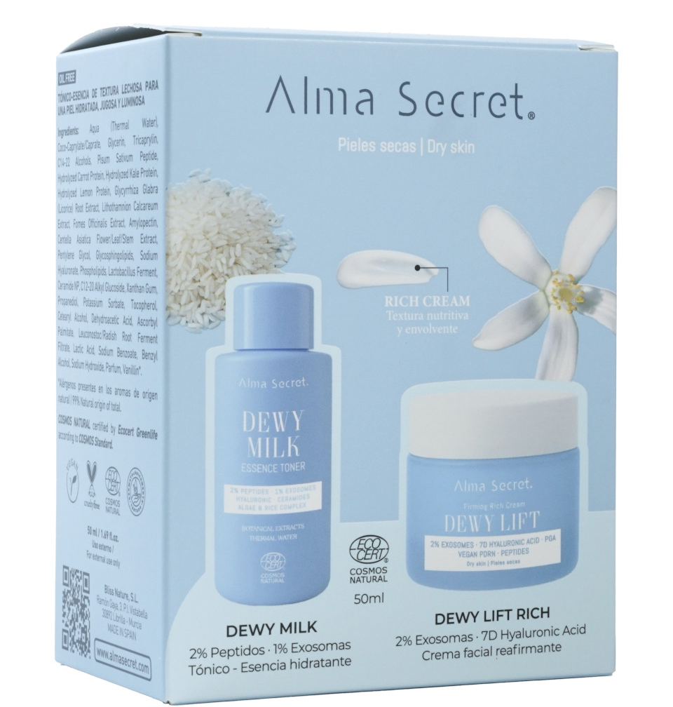 Dewy Milk hidrata, calma y prepara la piel tras la limpieza gracias a su textura ligera y a su combinación de exosomas, ceramidas y péptidos. Dewy Lift Rich Cream completa la rutina con una nutrición profunda y reafirmante gracias al PDRN vegano y al ácido hialurónico 7D. Un dúo sencillo, eficaz y muy apetecible. Disponible en la web de Alma Secret.