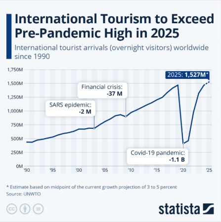 A pesar de la caída sin precedentes registrada en 2020 y 2021, el turismo internacional ha experimentado un crecimiento sostenido en las últimas décadas. En los años noventa, el número de turistas internacionales rondaba los 500 millones anuales, una cifra que en 2010 ya había alcanzado los 1.000 millones. Desde entonces, el número de turistas extranjeros no dejó de crecer hasta la llegada de la pandemia. Con los 1.527 millones registrados en 2025, el sector vuelve a romper su techo histórico.