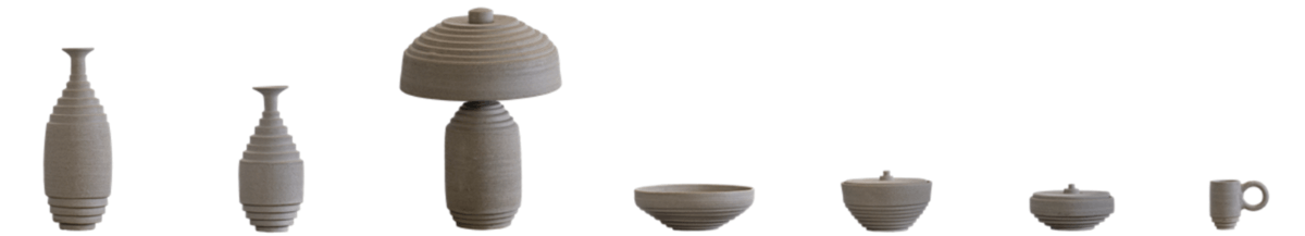 Cada pieza de la colección se construye capa a capa y se tornea a mano de manera individual, garantizando que no existan dos objetos iguales. Se utiliza gres chamutado cocido a alta temperatura, con un esmaltado que remite a materiales esenciales como el cemento, la cal, el hierro y los textiles.