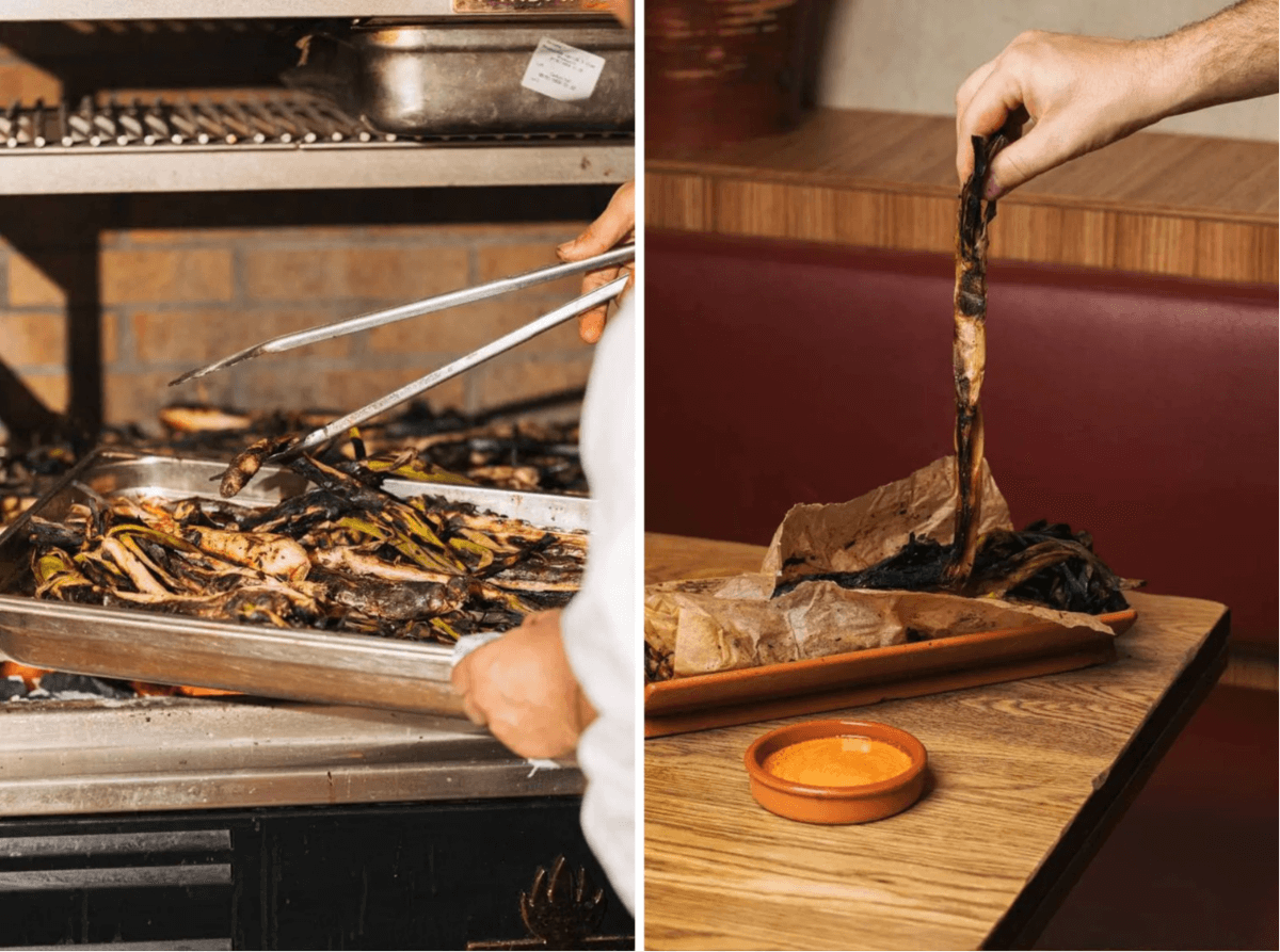Una calçotada, disponible sábados y domingos, que incluye ensalada de tomates confitados y por supuesto, calçots con salsa romesco, acompañados de una parrillada de carne que incluye butifarra blanca y negra, tocino y pechuga de pollo con patatas a la brasa y alioli.