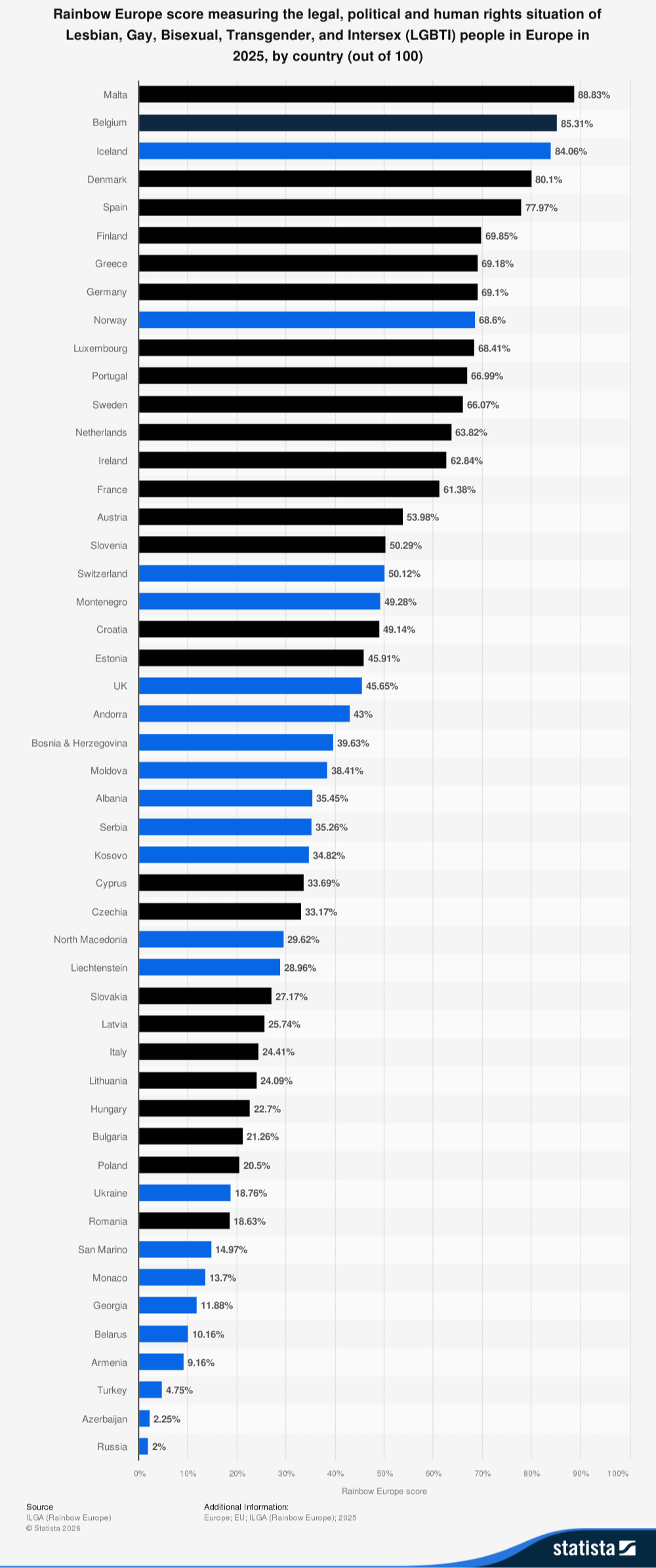 El ranking lo lidera, una vez más, Malta, con una calificación del 88,83 %, seguida de Bélgica (85,31 %), Islandia (84,06 %) y Dinamarca (80,01 %).
