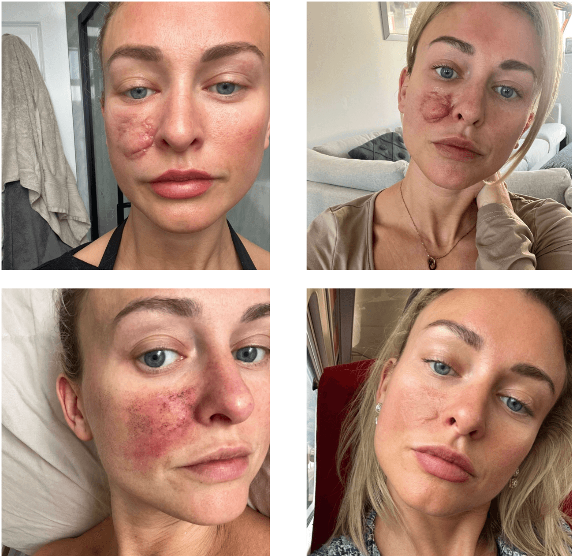 De izquierda a derecha la piel de Holly Taylor 1 día después de la primera sesión y 2 días después, 1 día tras la segunda sesión y 1 mes después de somteserse a la cuarta sesión. Apenas 5 meses después del traumático episodio,