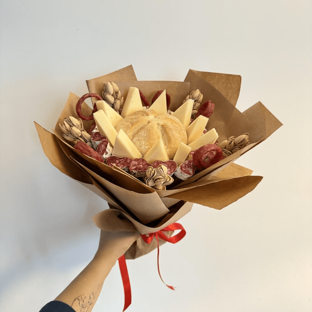Ramo gastronómico: Ramo con queso y fuet. Una propuesta original que combina flores y productos gourmet, perfecta para sorprender con un regalo diferente.
