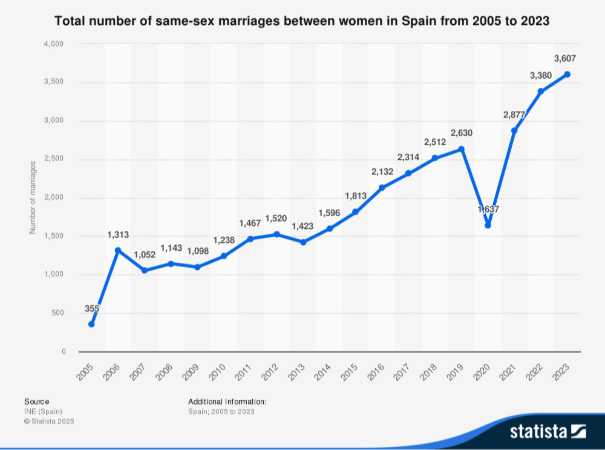 Desde su aprobación en 2005, el número de bodas LGTBI no ha dejado de crecer año tras año. En el primer año de la legalización se registraron 355 matrimonios igualitarios. Al año siguiente, la cifra se elevó hasta los 1.300. Tras mantenerse en torno a los 1.000 enlaces anuales durante varios ejercicios, en 2015 se superaron por primera vez los 1.500 matrimonios en un solo año. Desde entonces, la cifra continuó al alza y en 2018 se superó la barrera de las 2.000 uniones.