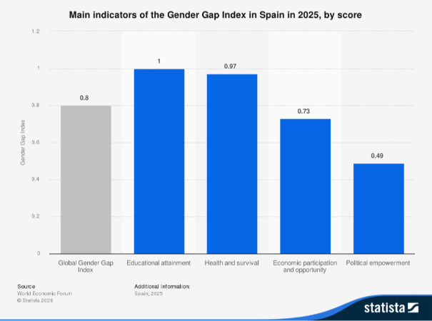 La brecha de género es todavía mayor en el empoderamiento político. En este caso, la puntuación es de 0,49 puntos, lo que implica que la representación y presencia política de las mujeres sigue siendo significativamente inferior a la de los hombres.