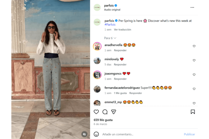 En el perfil de Parfois muestran un look propio de los días en los que el sol nos acompaña y la temperatura exterior es agradable. La modelo luce unos pantalones vaqueros con bordados, una camisa blanca con cuello alto, unas chanclas de dedo y unas gafas de sol. Le pone el broche de oro a la vestimenta con un pañuelo azul marino que se coloca como si fuese un fajín, separando visualmente la parte superior de la inferior.