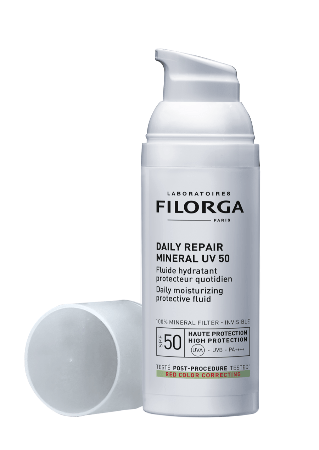 FILORGA presenta el protector de doble acción Daily Repair Mineral UV 50, que combina un escudo físico con un refuerzo intensivo de la barrera cutánea. Se trata de un fluido que utiliza un filtro 100 % mineral con óxido de zinc transparente. Este filtro crea un escudo físico que refleja los rayos UVB y UVA, proporcionando protección inmediata tras la aplicación. Su característica diferencial es la textura: ligera y no grasa, se absorbe completamente para un acabado invisible, sin residuo blanco. Además su fórmula incluye un complejo de activos (reconocido por la comunidad dermatológica