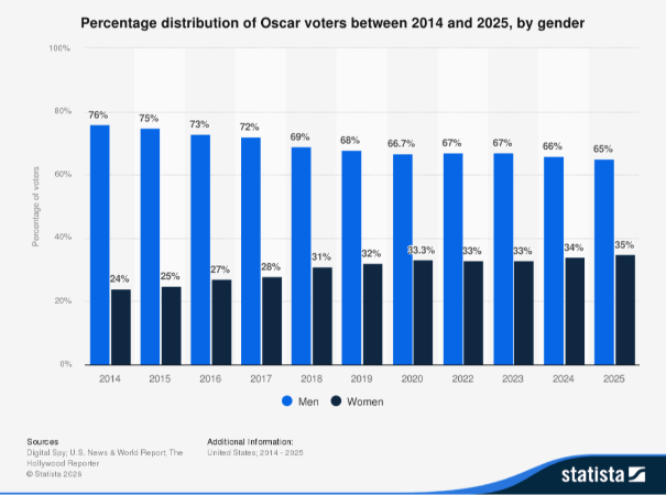 Pero la brecha de género en los Oscar no se produce solo en los galardones, sino que también está presente en las votaciones. Según datos de The Hollywood Reporter, en la edición de este año el 65% de los votantes de la Academia eran hombres, frente al 35% de mujeres.