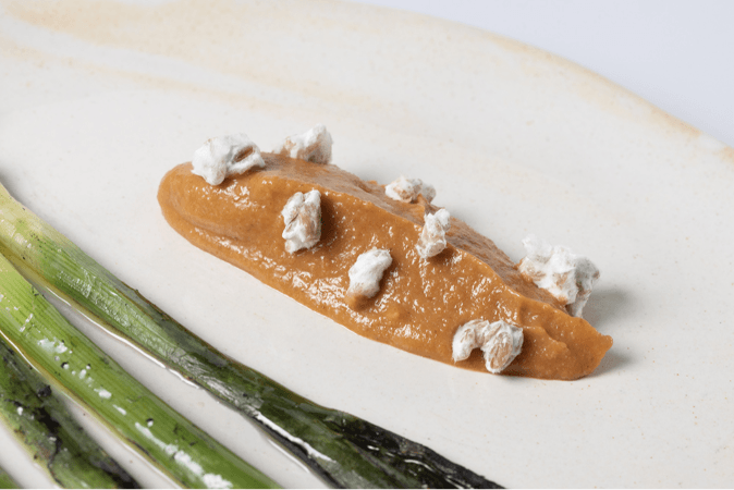 Mini puerros con romesco y koji.