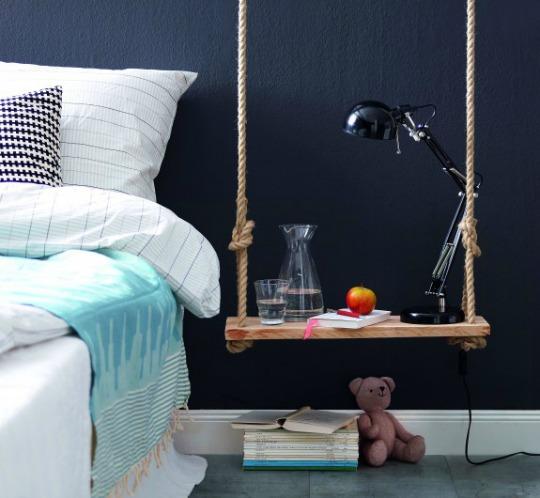 La primera idea la ha tenido urban outfitters y es una mesita colgante que consiste en utilizar unas tablas de madera envejecidas y unirlas. Lo siguiente es anclar o fijar unas cuerdas de aire rústico a cada esquina y unir las cuatro mediante una hembrilla que irá al techo. Lo cierto es que para hacer este proyecto en vez de clavar tú misma los tableros, también puedes utilizar un columpio de madera o coger un trozo de madera del campo y alisar la superficie con una lijadora, lo que te resulte más sencillo.